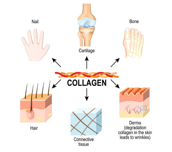 - Collagen xuất hiện ở hầu hết các bộ phận trong cơ thể như da, xương, khớp, mạch máu, tóc, giác mạc, móng ….gân và dây chằng.