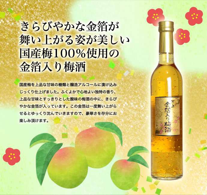 - Rượu mơ vảy vàng Kikkoman Nhật mang một hương vị tươi mát và ngọt thanh pha trộn những dát vàng mỏng lấp lánh, khiến chai rượu trở nên lung linh, tạo nên sự sang trọng, ấn tượng cho các bữa tiệc cùng gia đình và bạn bè. Rượu mơ vảy vàng thích hợp cho cả nam và nữ bởi độ cồn thấp chỉ 13%.