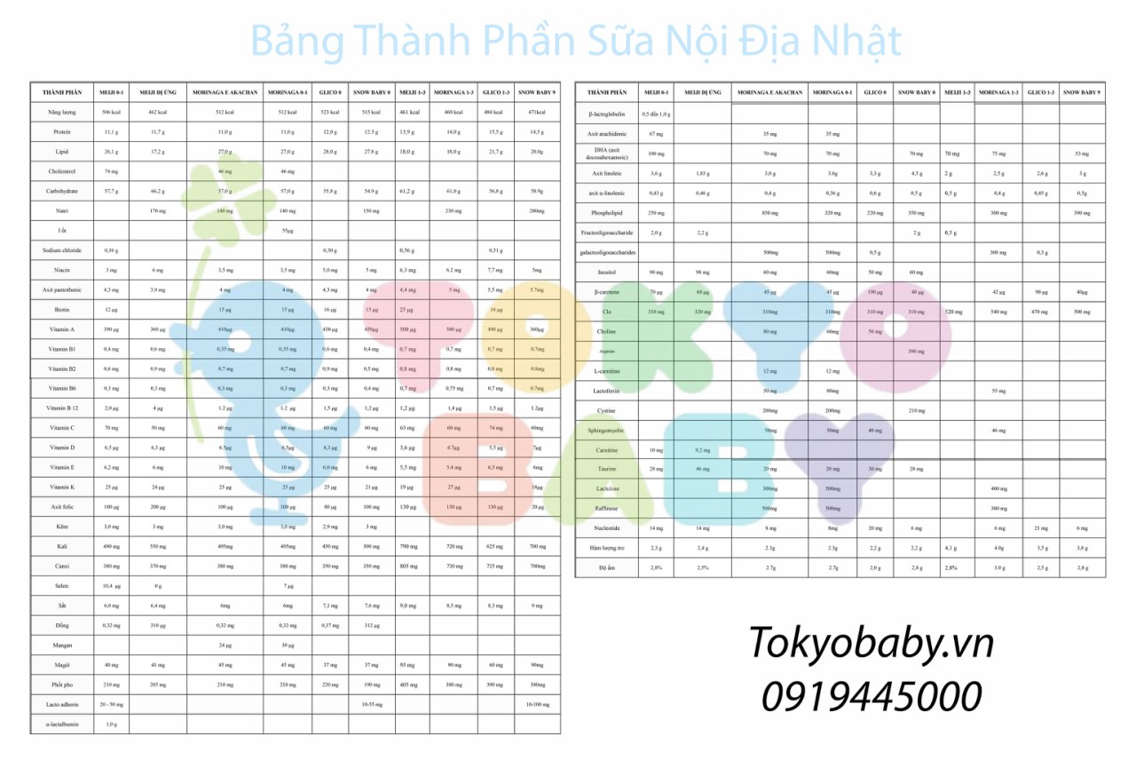 3. Bảng so sánh các thành phần sữa nội địa Nhật: