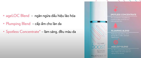 - AgeLOC Boost Activating Serum- sản phẩm được thiết kế để phù hợp với máy đẩy tinh chất Ageloc Boost, tạo nên sự dẫn điện phù hợp nhất của Ageloc Boost để đưa đến dòng điện vào làn da của mình phát huy hiệu quả dòng điện.